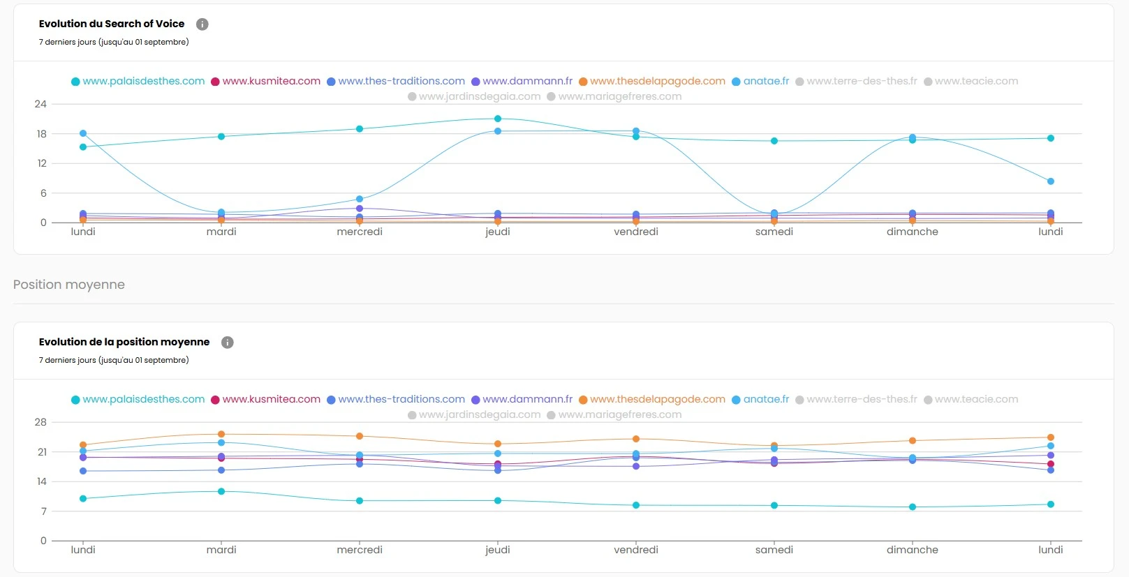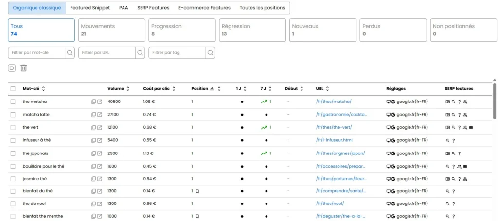 J’avoue qu’après avoir galéré avec d’autres plateformes aux interfaces archaïques, c’est un vrai soulagement. Tout est là où on s’attend à le trouver, les métriques importantes sont mises en avant (position moyenne, score de visibilité, part de voix), et on n’a pas à naviguer dans 15 onglets pour trouver l’info qu’on cherche.